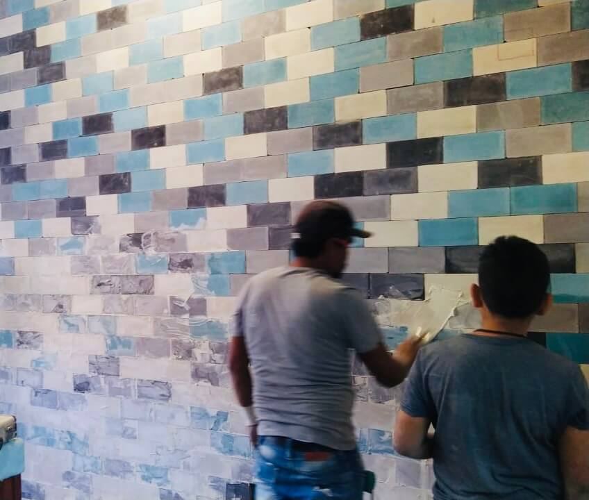 Se desgasta la superficie y se pegan los bloques con pega azulejo, con la intención de asegurar la fijación del producto por más tiempo.